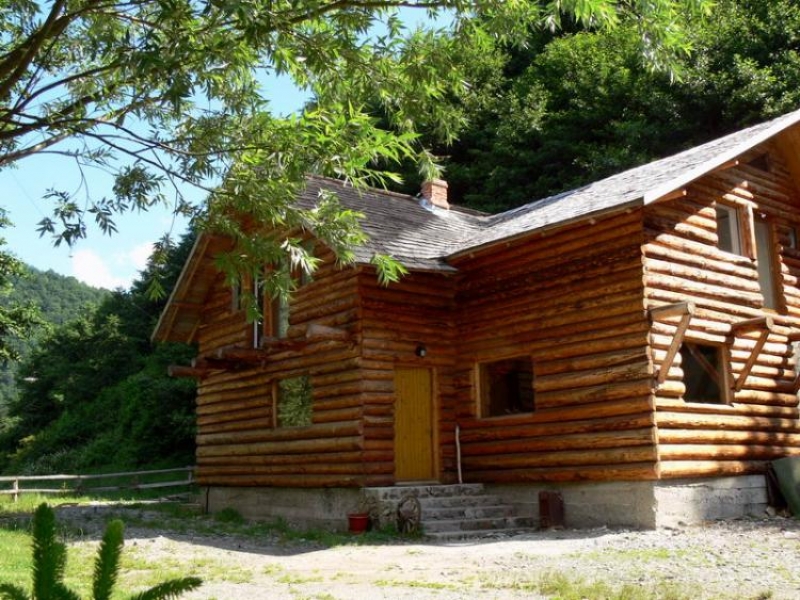 Cabana este constuita din busteni de lemn masiv si piatra in stil rustic.